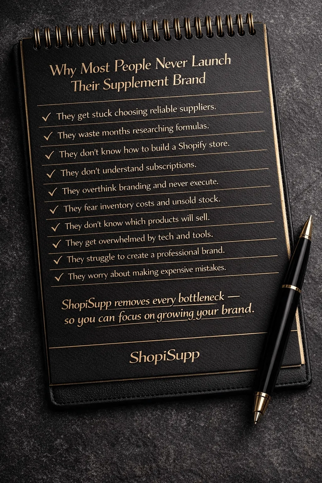 ShopiSupp is the easiest and most reliable way to launch your own supplement brand. We handle everything from product sourcing and branding to fulfillment and integrations, so you can focus on growing your business.