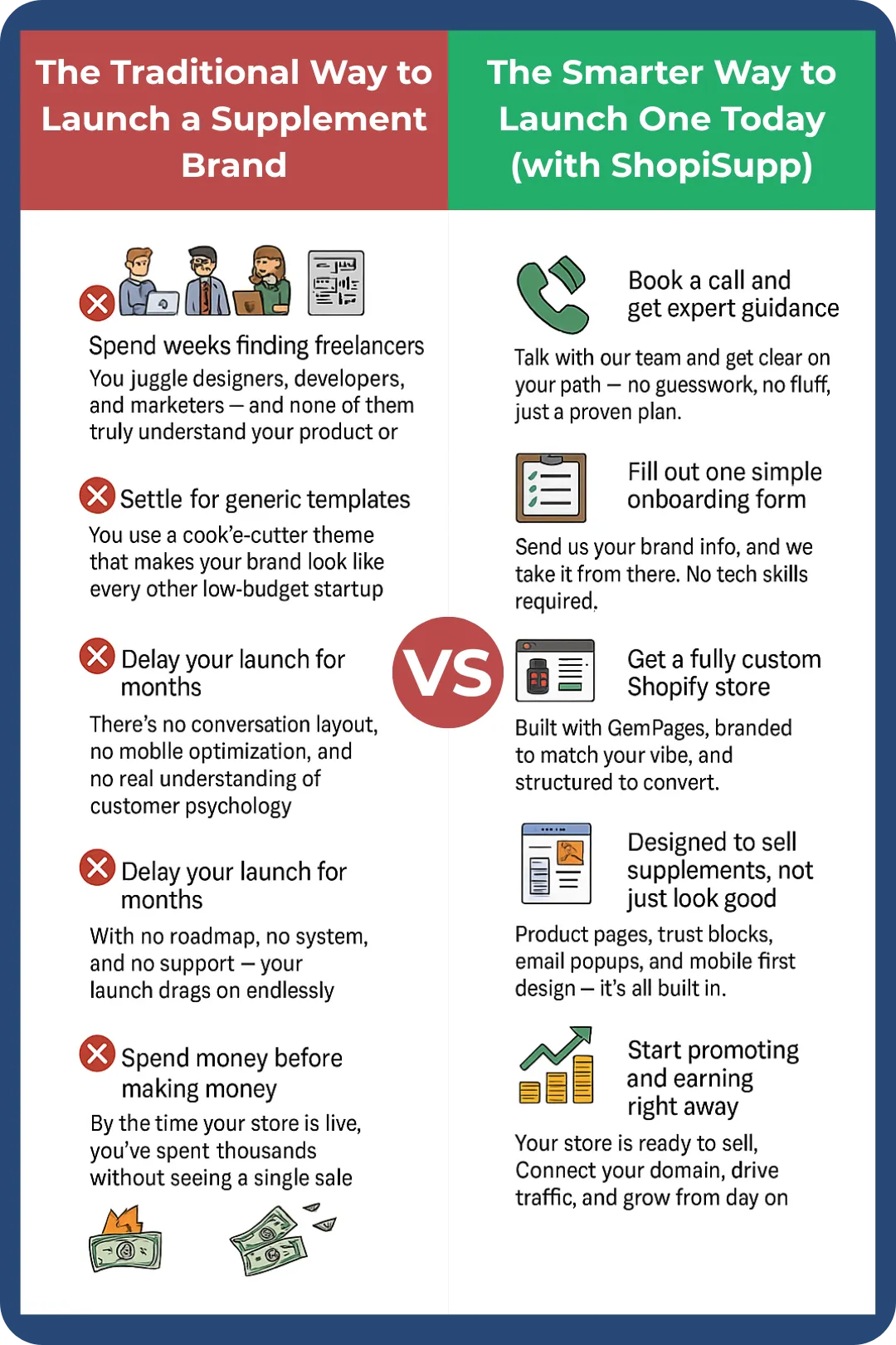 The supplement market is exploding, and the opportunity is wide open for new brands. With ShopiSupp, you get a ready-to-launch Shopify store, custom label design, and the tools to attract customers fast. Instead of wasting months building from scratch, you can step into a proven system and start selling in one of the world’s fastest-growing industries.